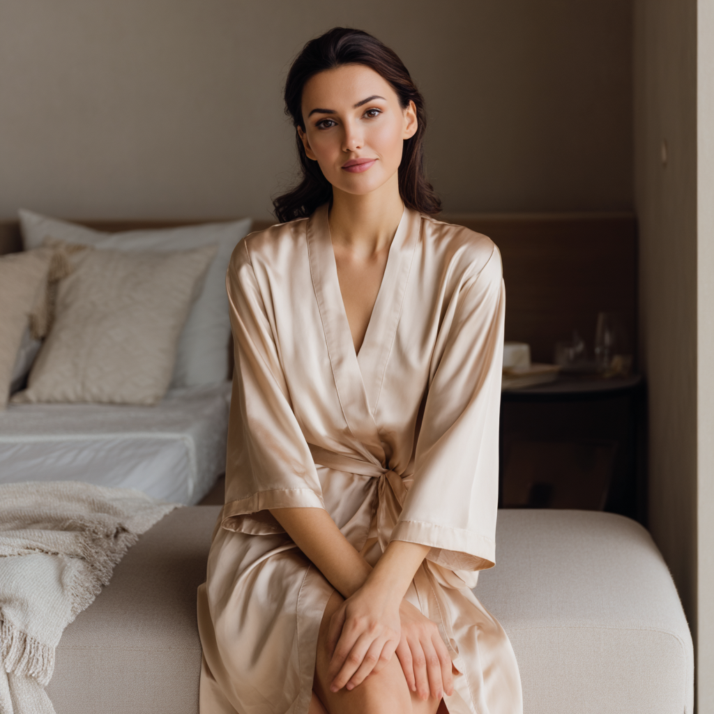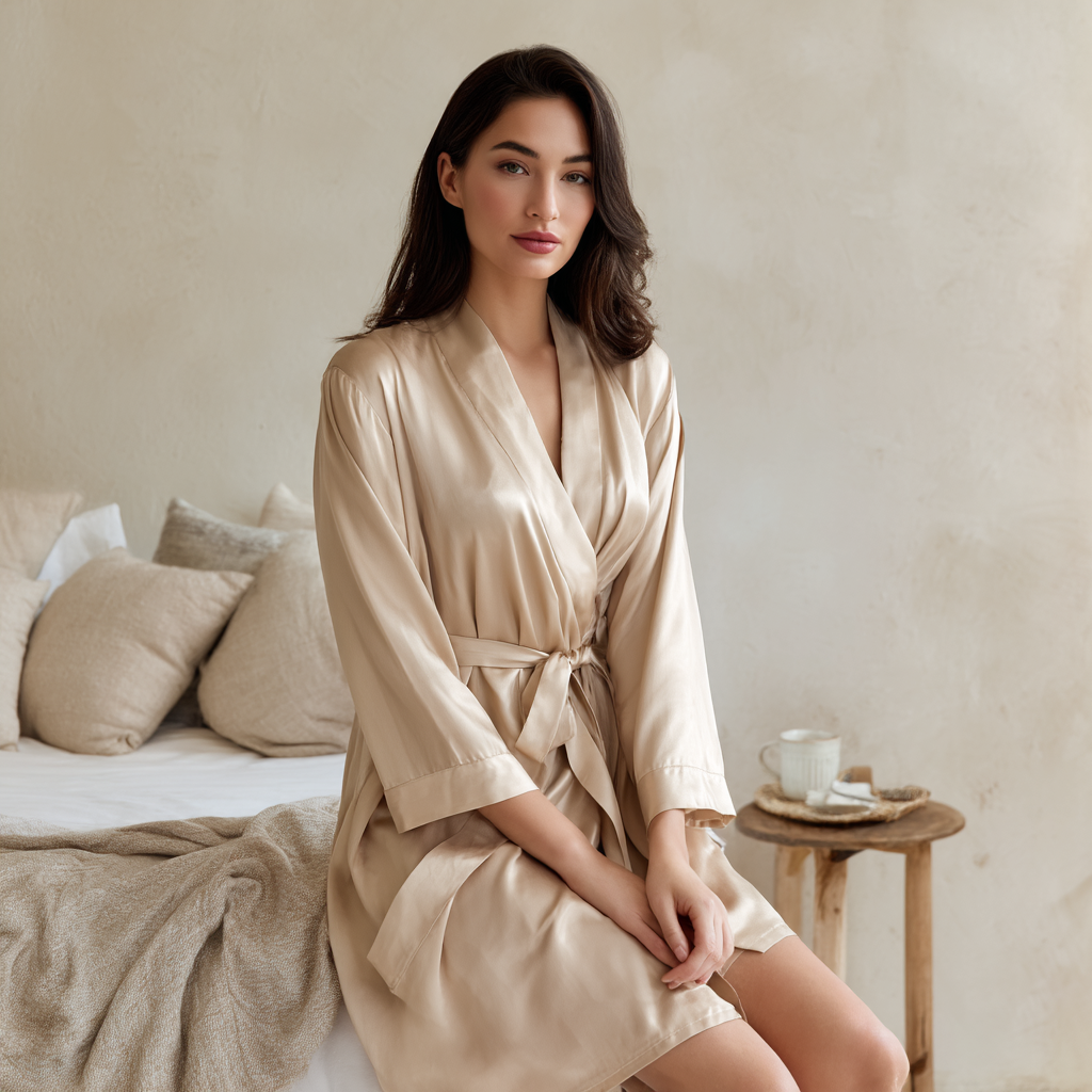Efect termoregulator: Mătasea reglează natural temperatura – încălzește în zilele răcoroase și răcorește în cele calde, făcând acest halat alegerea perfectă pentru orice anotimp.