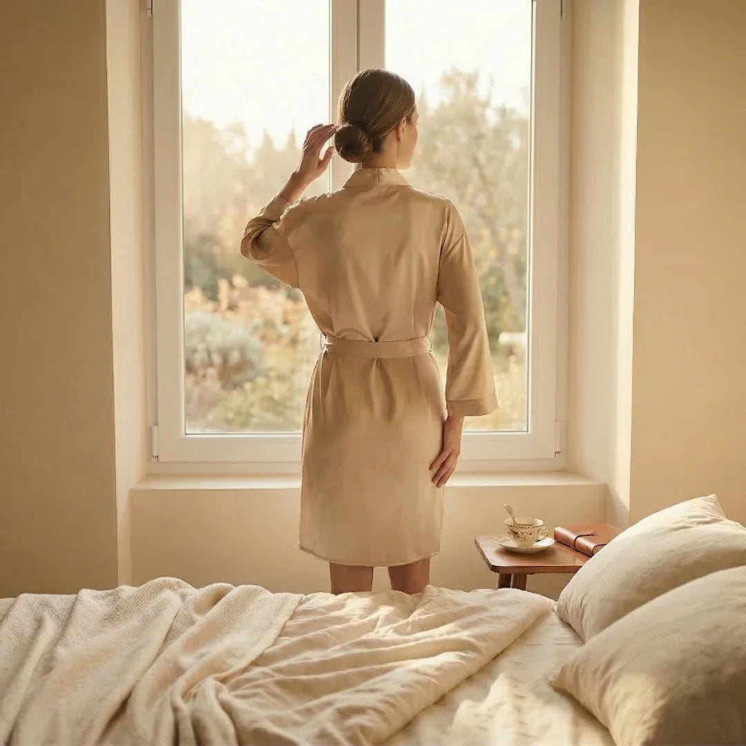 Efect termoregulator: Mătasea reglează natural temperatura – încălzește în zilele răcoroase și răcorește în cele calde, făcând acest halat alegerea perfectă pentru orice anotimp.